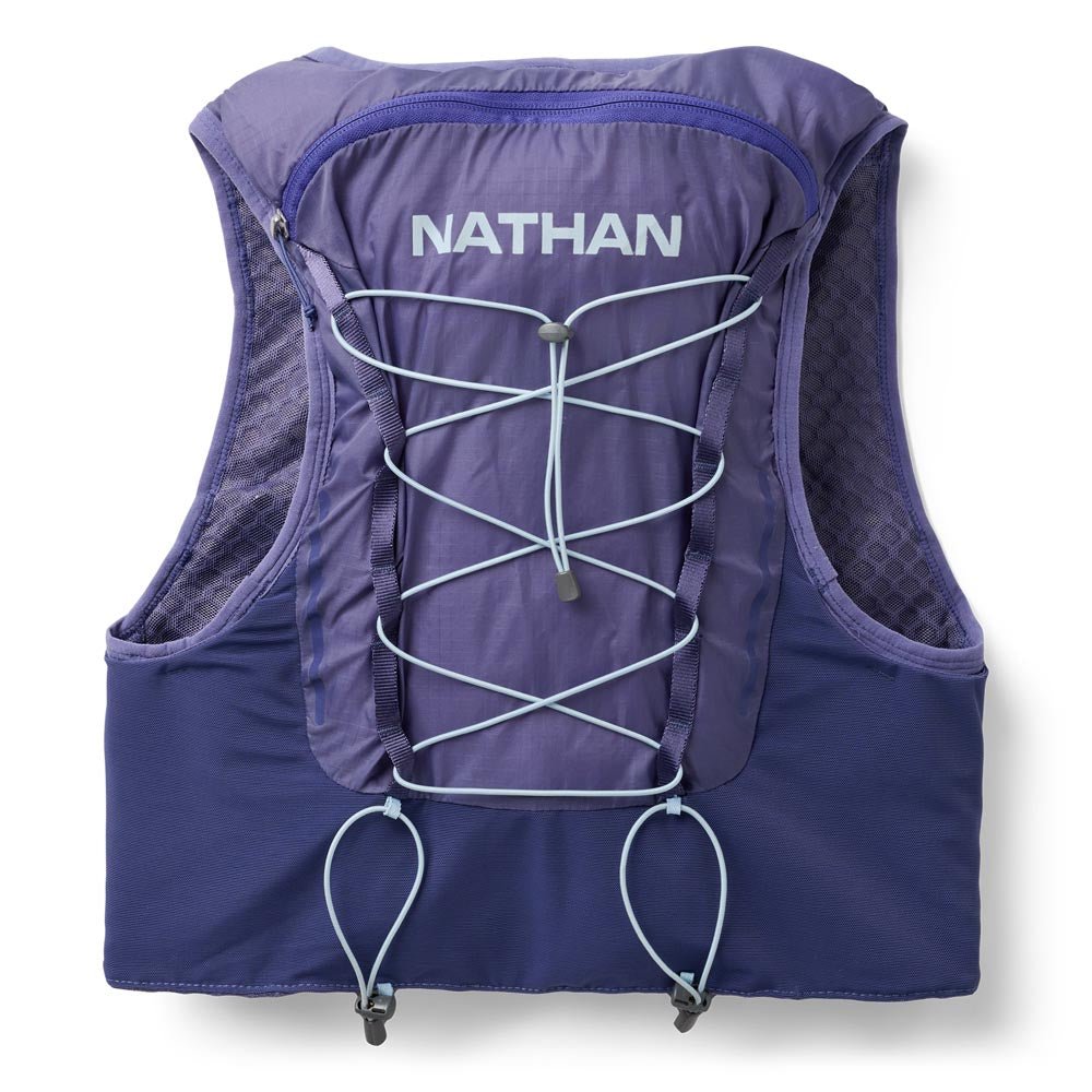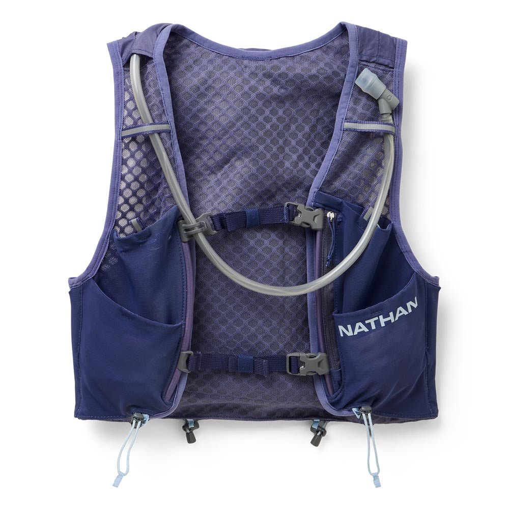 Includes a 2L Nathan x Hydrapak bladder with quick-release hose for easy cleaning. Four front expandable mesh pockets (top pockets with elastic cords to secure flasks), one interior zip pocket for valuables, 2 side mesh pockets with passthrough features, a rear main compartment with bladder sleeve, exterior bungee for extra gear, and pole keepers on the lower back.